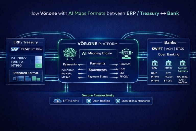 Conectamos con tu ERP/Treasury en su formato y protocólo, sin requerir cambios en tu configuración actual, ni de nuevos formatos. Validamos la calidad de la información con el poder del AI Mapping Engine.